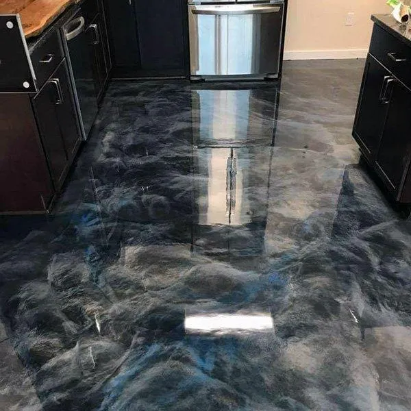The most decorative and easily customizable 3D floor system on the market. It's a mixture of colored basecoat and metallic powder pigments, applied using different application techniques. These floors are always one-of-a-kind, stain, scratch and chip-resistant. Non-porous, light-reflective and easy to maintain and clean.